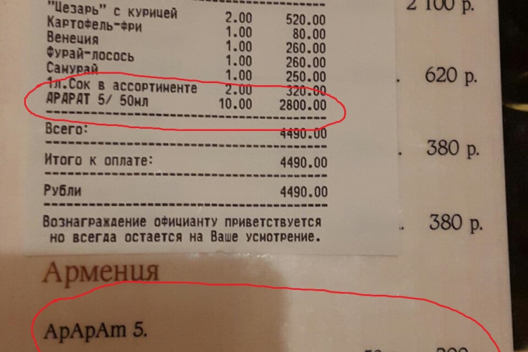 Странно, за полчаса до этого разговора корреспондент «КИ», представившись обычным клиентом, пытался сделать заказ в «Миндале» по телефону. Цену на «Арарат» 5 звёзд ему назвали в 2000 руб. за 0,5 л. Интересно, какая сумма была бы в чеке при расчёте?