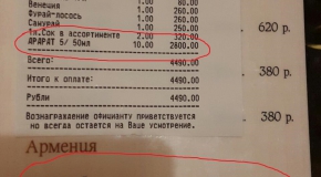 Но больше всего девушек поразила разница цен в меню и в чеке. Коньяк за время ужина вдруг подорожал с 2 тыс. рублей за бутылку до 2800 рэ. Салат «Цезарь» – с 230 руб. до 260 за порцию. Итого, почти 900 рублей разницы.