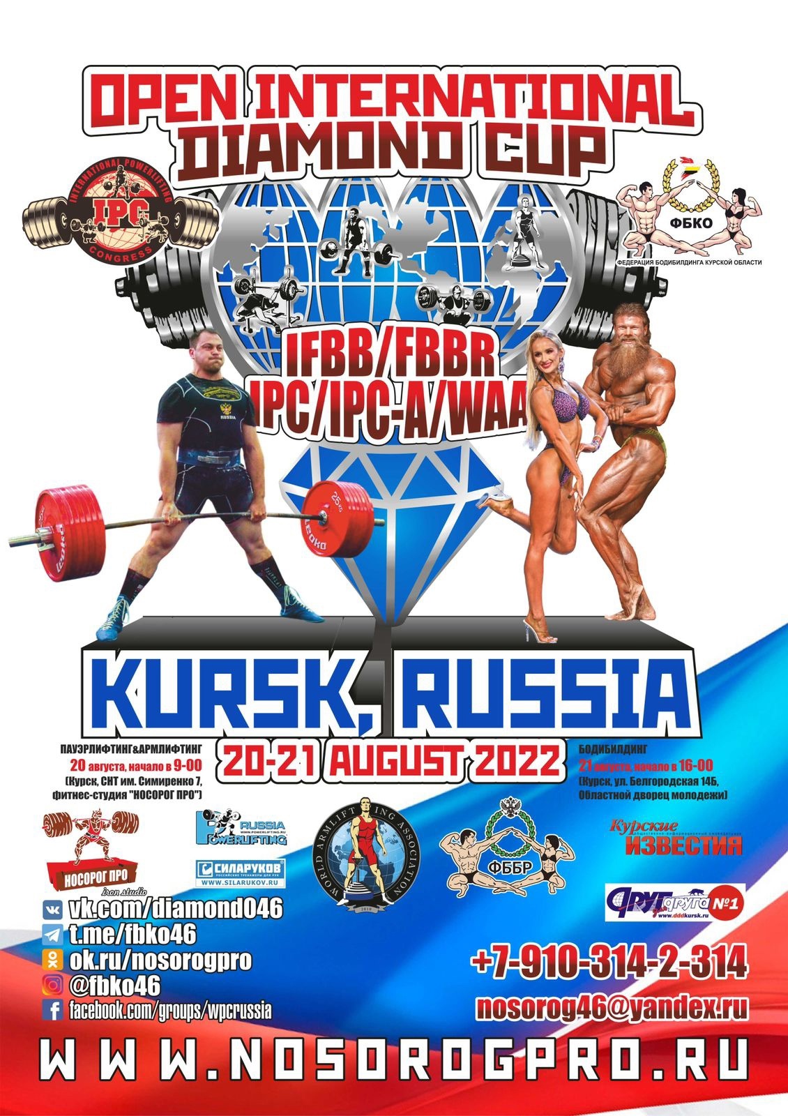- OPEN DIAMOND CUP IPC/IPC-A/WAA - турнир по пауэрлифтингу и армлифтингу (20 августа, начало в 11-00, фитнес-студия "НОСОРОГ ПРО" (Курск, СНТ им. Симиренко,7, вход свободный);