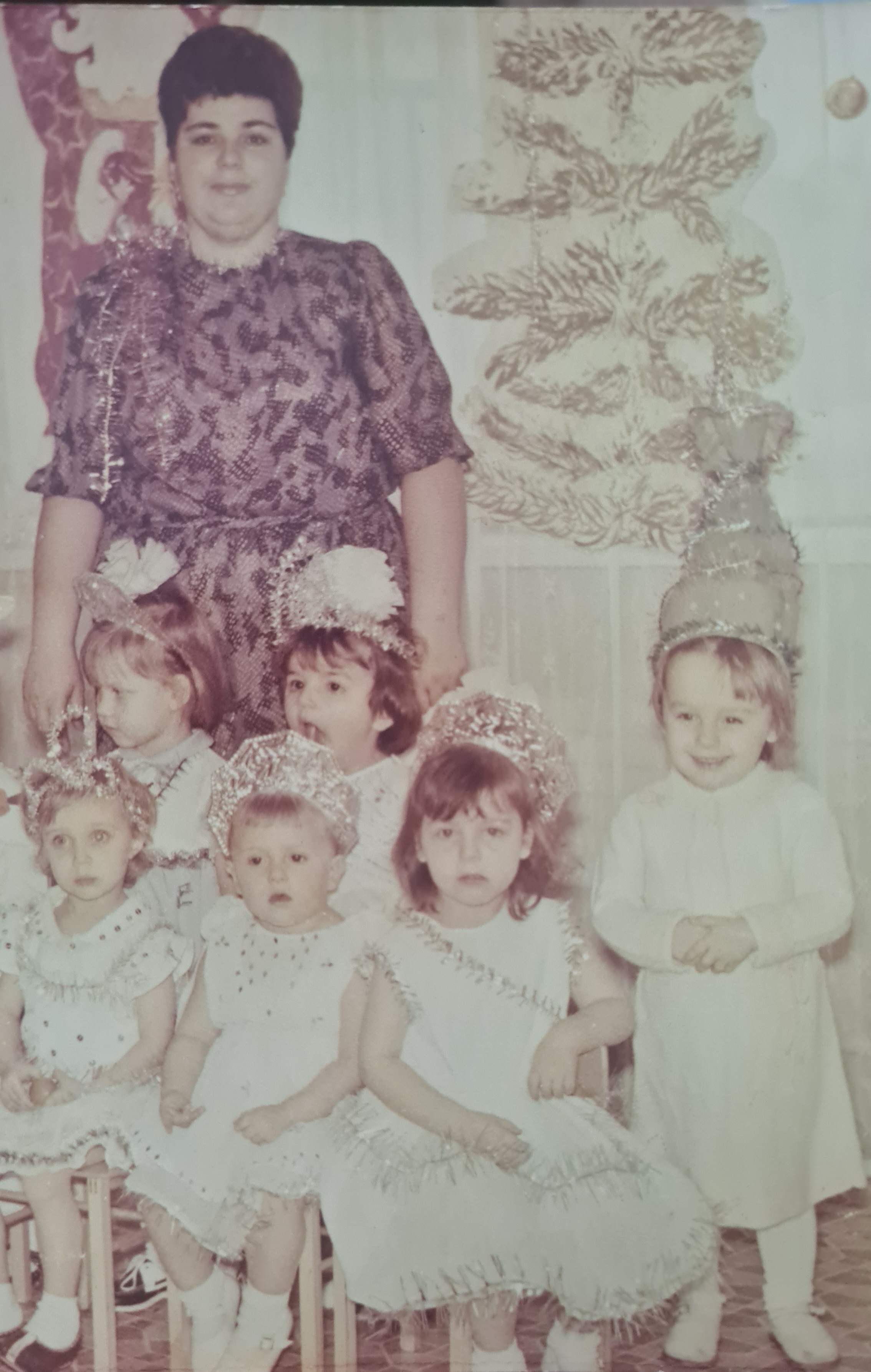 – Я на фото справа. Год 1991 или 1992. История фотографии была такова: мама перед утренником заранее подготовила мне красивое платье и новые босоножки, но тут внезапно выяснилось, что ей нужно срочно уйти по каким-то важным делам.