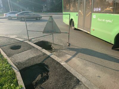 Здесь и раньше был небольшой провал на тротуаре. Коммунальные службы засыпали его песком, но после ливней на прошлой неделе образовались еще две ямы. Самая большая на проезжей части. Ограждение периодически падает, есть опасность попасть в яму колесом. Будьте внимательны.