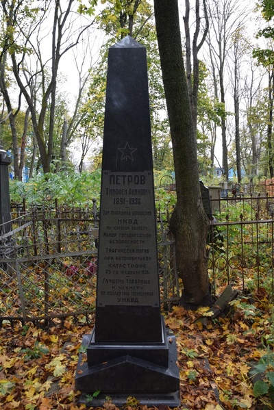 Первая могила принадлежит замначальника управления НКВД по Курской области, 45-летнему майору госбезопасности Тимофею Акимовичу Петрову, погибшему в автокатастрофе в феврале 1936 года. Известно, что до назначения в Курск он служил в ОГПУ Туркменской ССР. Внизу подпись: «Лучшему товарищу и чекисту от коллектива сотрудников УНКВД».