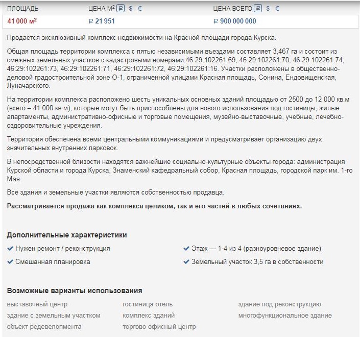Кстати, в марте 2023 года компания пыталась продать сразу два здания, расположенных в этом месте. Одно является объектом культурного наследия регионального значения «Здание архива Духовной консистории, 1836 год» площадью 303,9 кв. м, второе – 4-этажный недострой площадью 1272,6 кв. м, где ранее планировали разместить инфекционную больницу, но потом решили сделать гостиницу. Продажа велась по решению Министерства имущества Курской области. Изначальная цена контракта – более 27,3 млн. рублей. Власти заверили, что единственным участником и победителем стала индивидуальный предприниматель, владелица нескольких кафе в Курске. Покупка ей обошлась в 40 млн. 100 тыс. рублей.