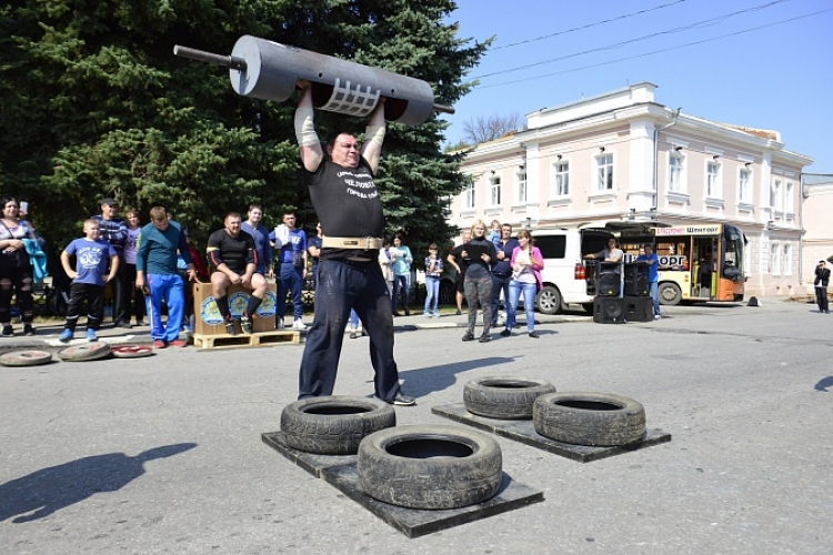 Сегодня в Ельце атлеты поднимали бревна и гигантскую гантель, тягали автомобиль и автобус, кантовали покрышку