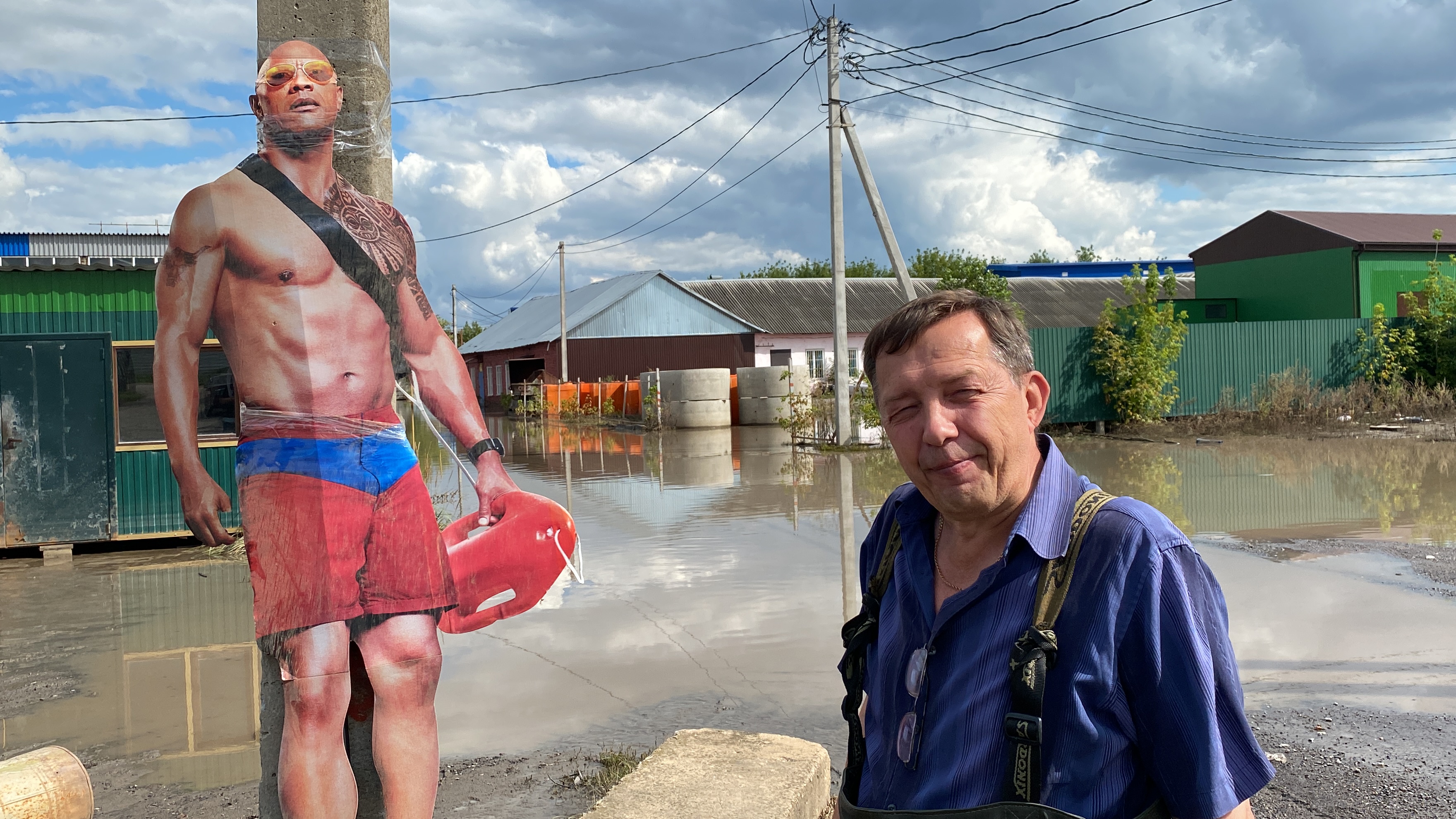 Промзона превратилась в большой водоём. Возле него нас встречают предприниматели и картонная фигура Митча Бьюкенена из фильма «Спасатели Малибу». Его примотали скотчем к столбу. Автор перформанса, инженер строительной организации Дмитрий Новиков объясняет:
