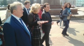 Делегация представителей администрации и СМИ встречала замминистра на перроне Железнодорожного вокзала, после все вместе они направились к скверу у Дома Советов. Его гостю презентовали как образец благоустройства.